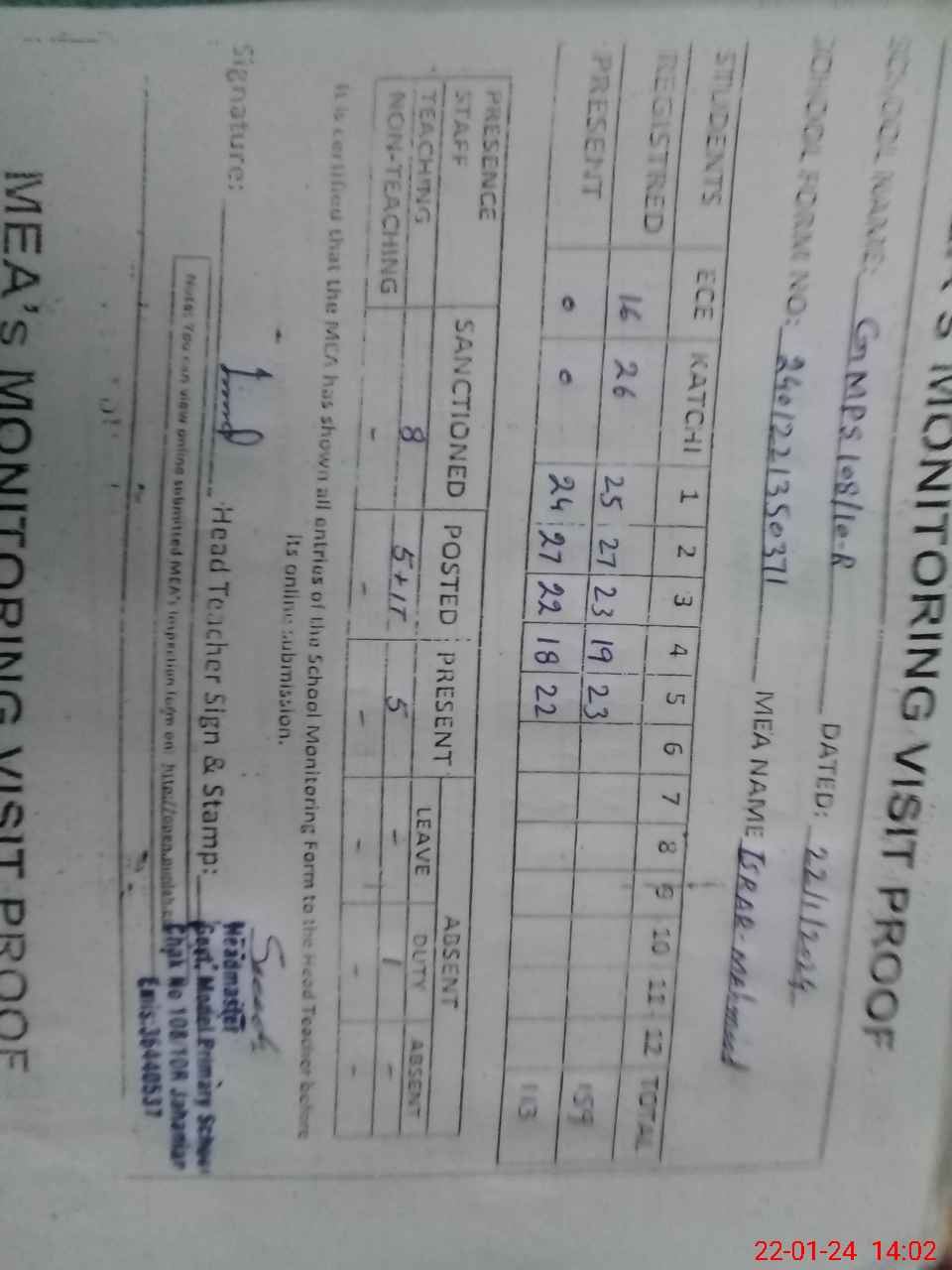 | Attendance Register | Head Teacher | MEA with School | Visit Proof |
