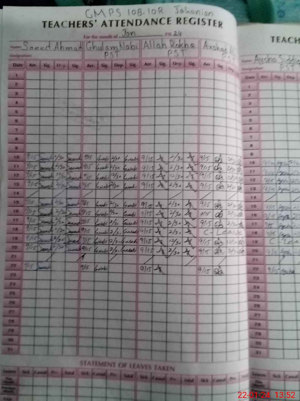 | CNIC | Full Name | Designation | R/C | Absence During Last Calender Month |