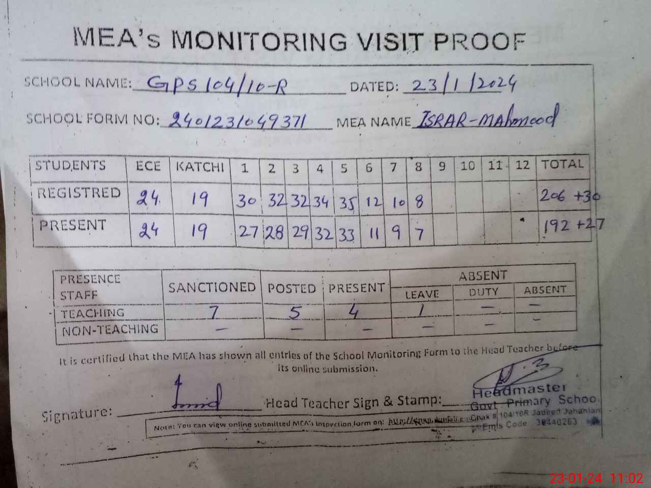 | EMIS Code: 36440263 | Name of School: GPS 104/10-R JADEED, P/O 105/10-R, JAHANIAN | |||