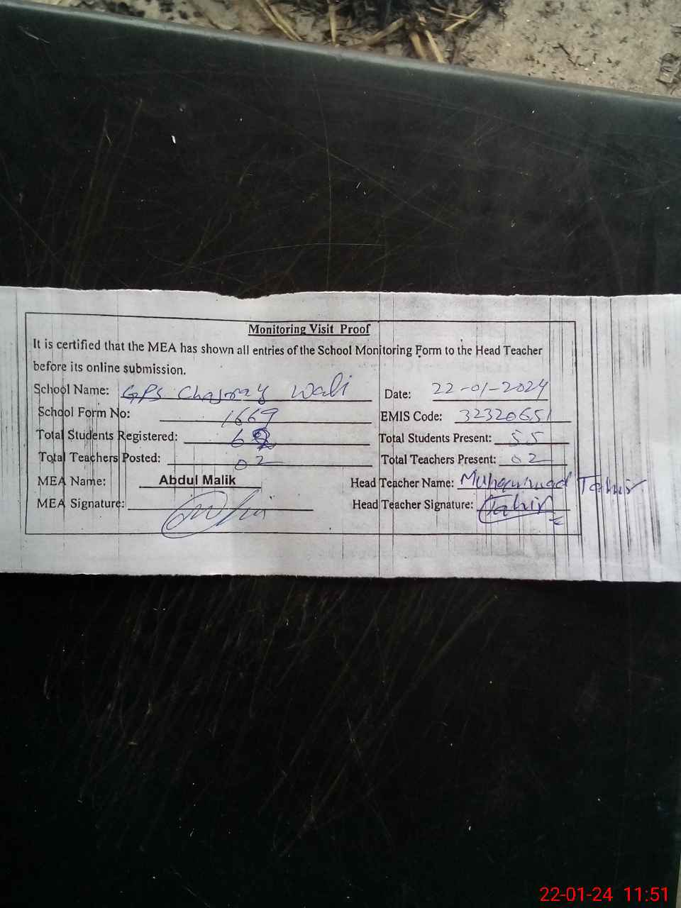 | Attendance Register | Head Teacher | MEA with School | Visit Proof |
