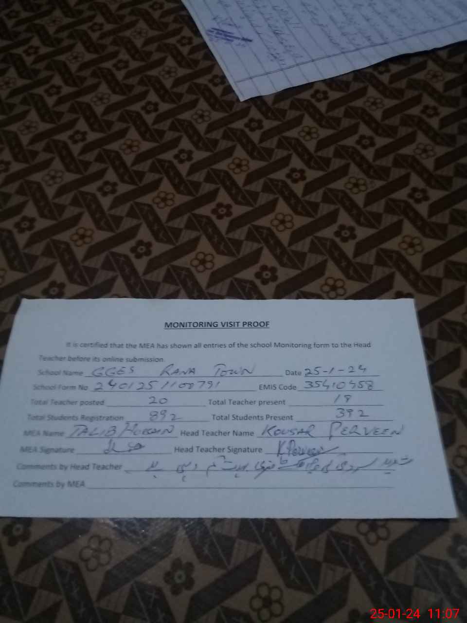 | Attendance Register | Head Teacher | MEA with School | Visit Proof |