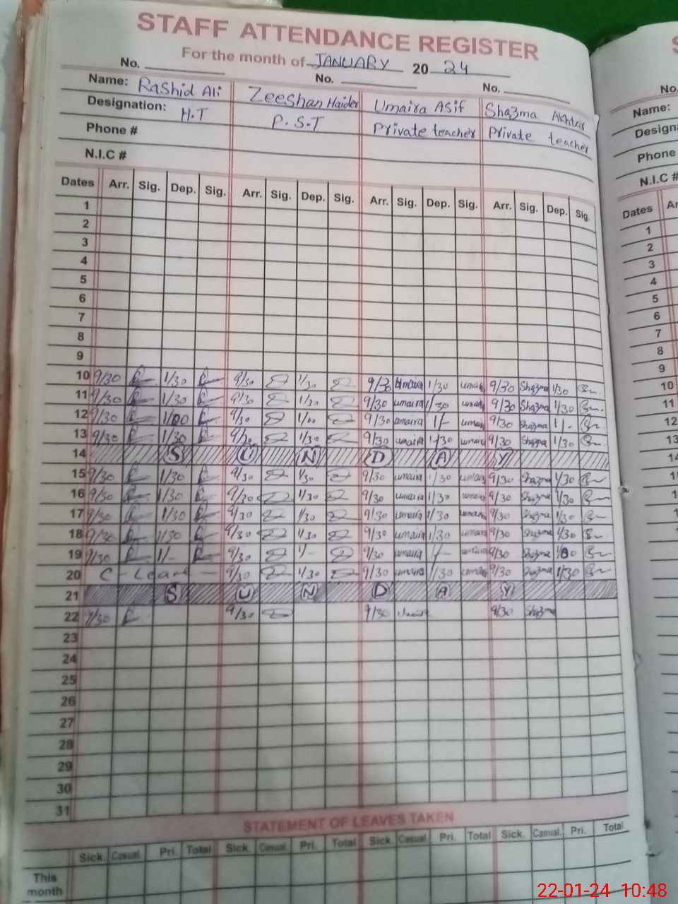 | CNIC | Full Name | Designation | R/C | Absence During Last Calender Month |