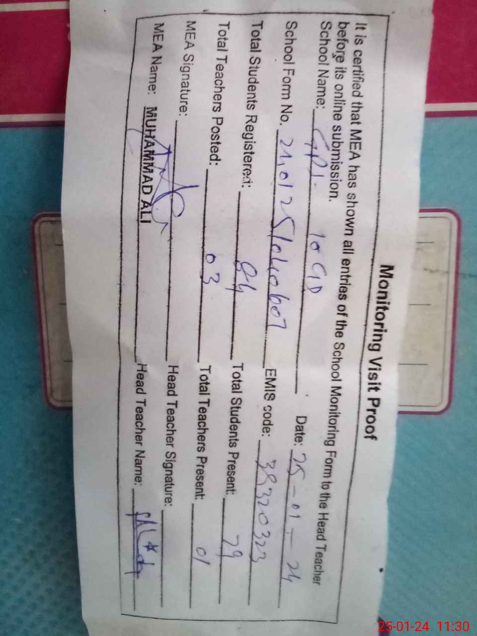 | Attendance Register | Head Teacher | MEA with School | Visit Proof |