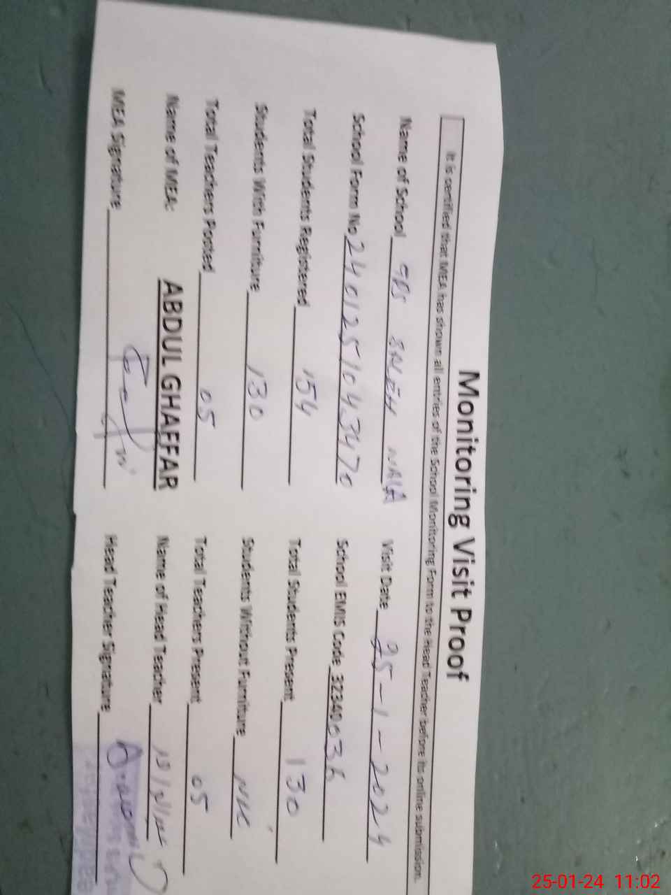 | Attendance Register | Head Teacher | MEA with School | Visit Proof |