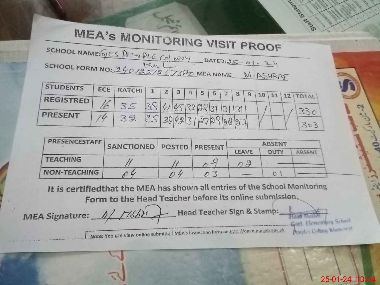 | Attendance Register | Head Teacher | MEA with School | Visit Proof |