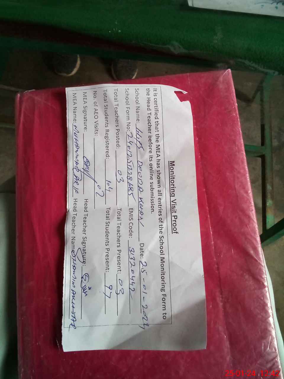 | Attendance Register | Head Teacher | MEA with School | Visit Proof |
