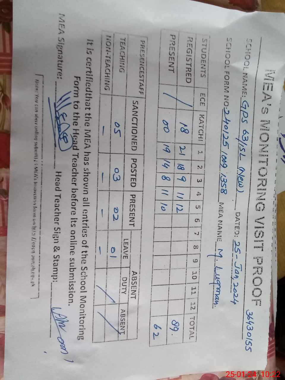 | Attendance Register | Head Teacher | MEA with School | Visit Proof |