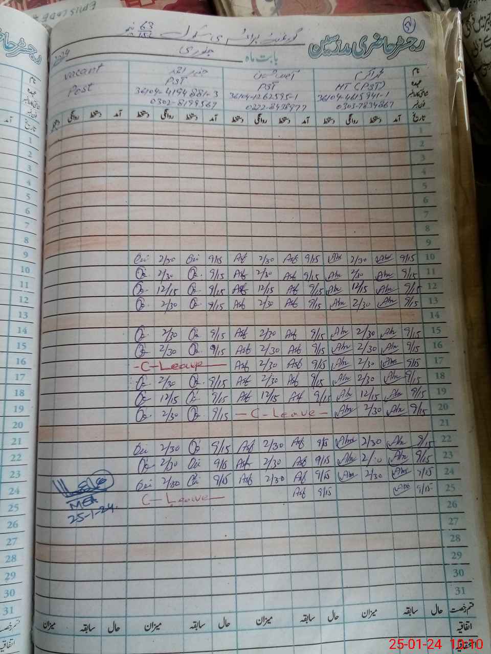 | CNIC | Full Name | Designation | R/C | Absence During Last Calender Month |