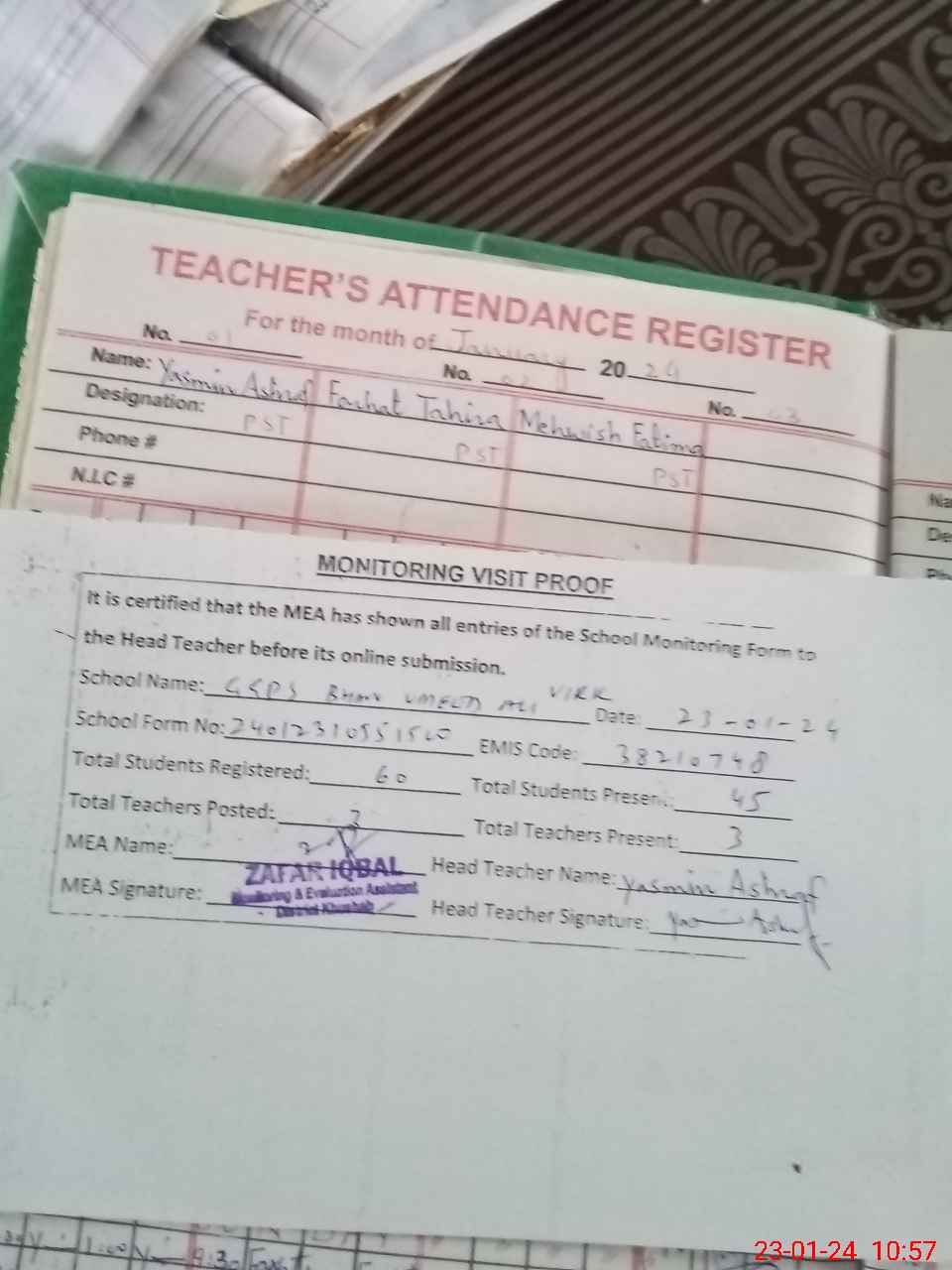 | Attendance Register | Head Teacher | MEA with School | Visit Proof |