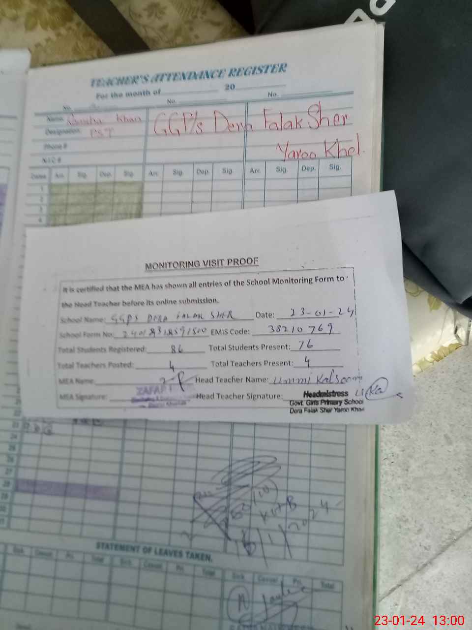 | Attendance Register | Head Teacher | MEA with School | Visit Proof |