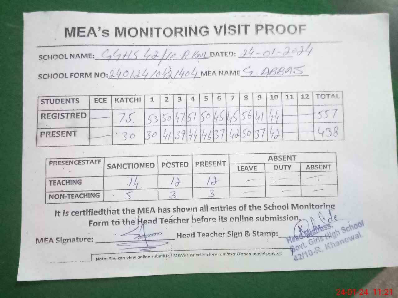 | Attendance Register | Head Teacher | MEA with School | Visit Proof |