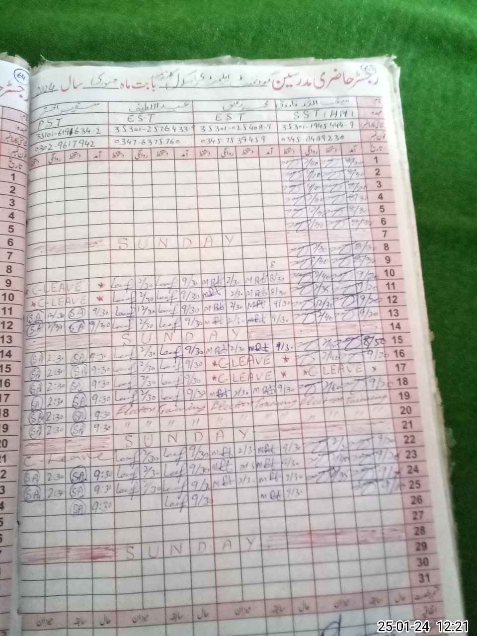 | CNIC | Full Name | Designation | R/C | Absence During Last Calender Month |