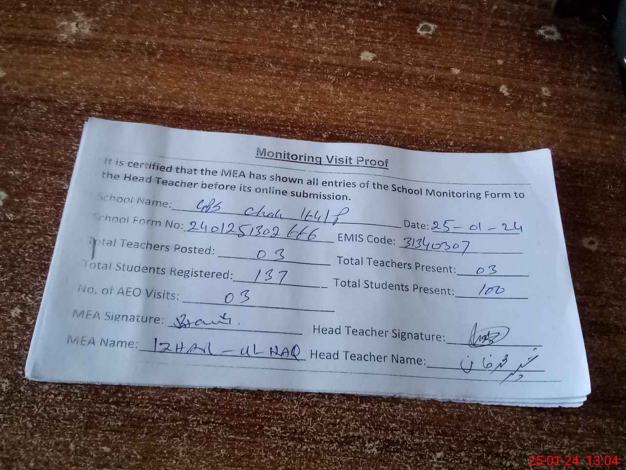 | EMIS Code: 31340307 | Name of School: GPS CHAK NO 164/P | |||