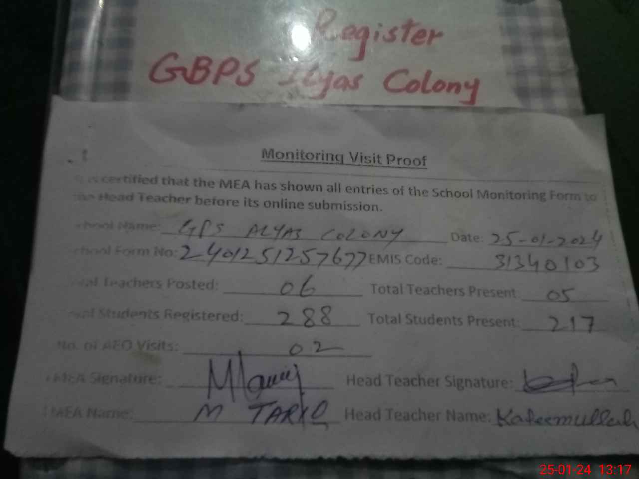 | Attendance Register | Head Teacher | MEA with School | Visit Proof |