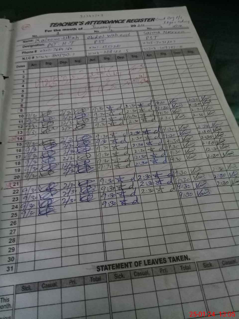 | CNIC | Full Name | Designation | R/C | Absence during last cal. month |