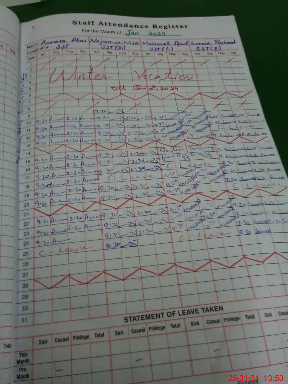 | Leave | Duty | Absent | Maternity | Medical | Ex- Pak |