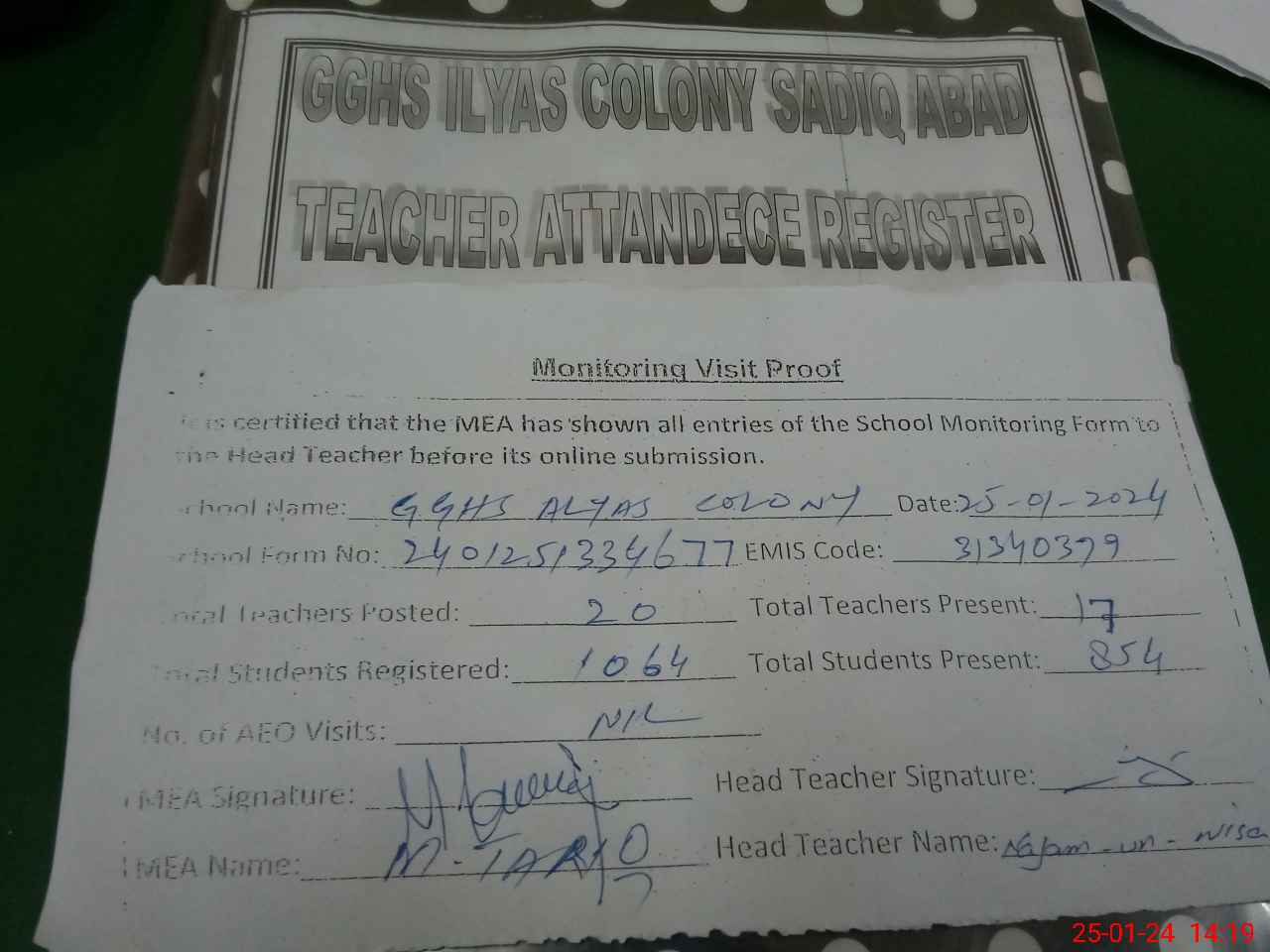 | Attendance Register | Head Teacher | MEA with School | Visit Proof |
