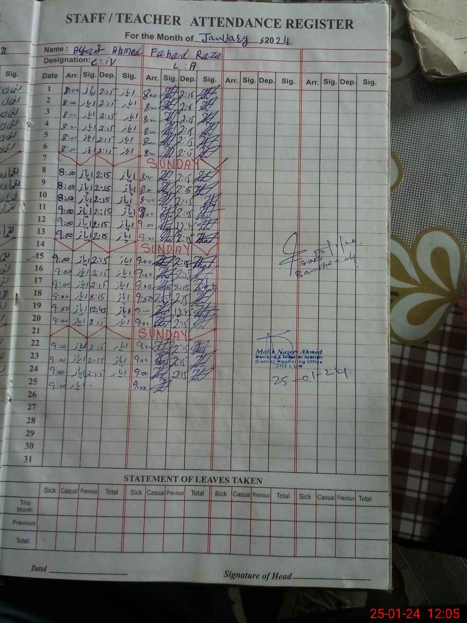| CNIC | Full Name | Designation | R/C | Absence During Last Calender Month |