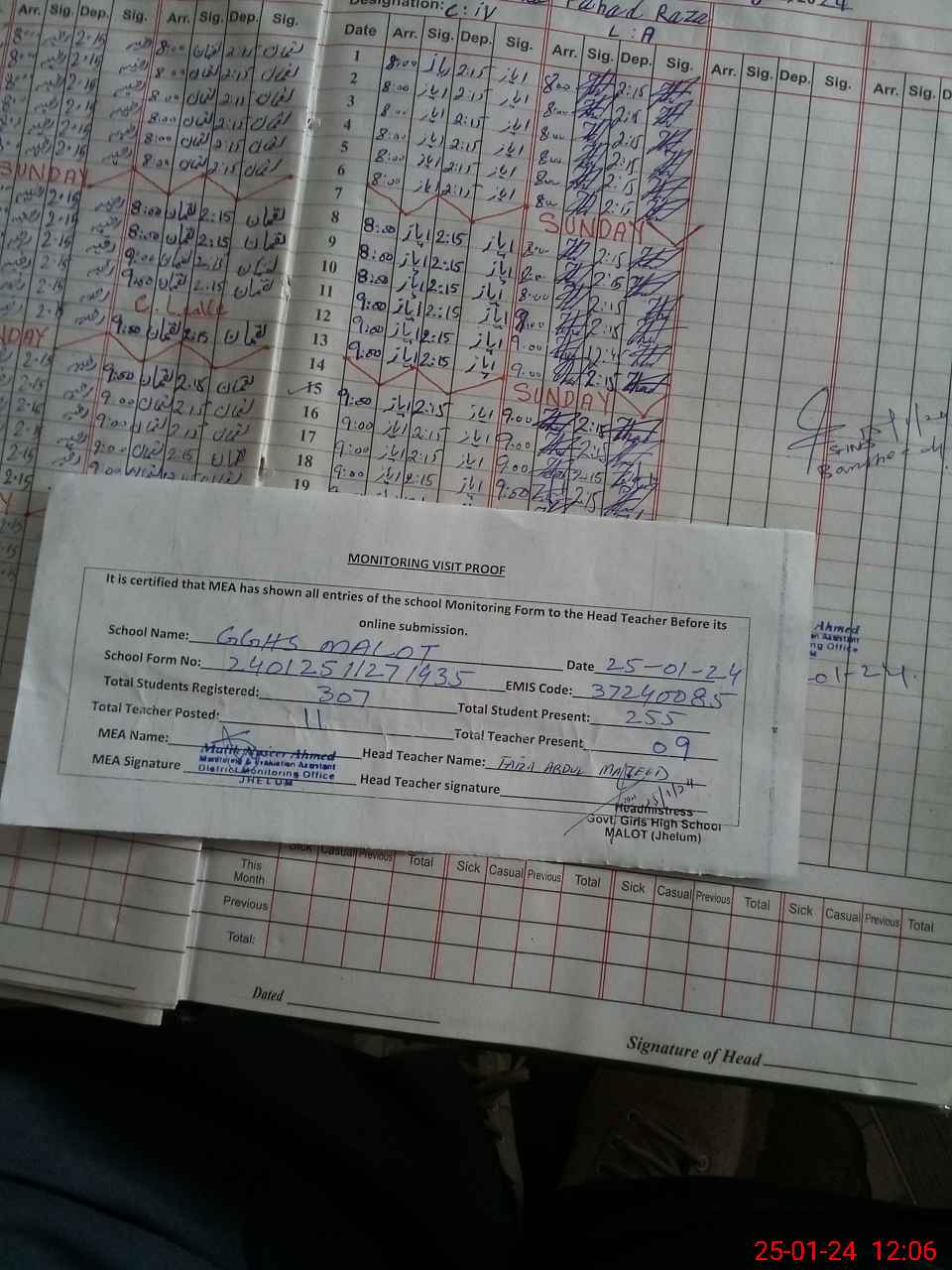 | Attendance Register | Head Teacher | MEA with School | Visit Proof |