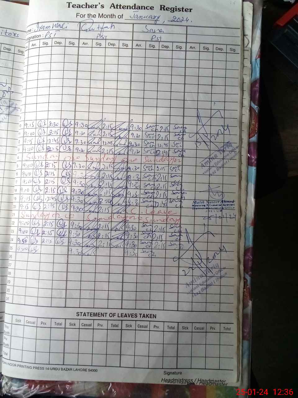 | CNIC | Full Name | Designation | R/C | Absence During Last Calender Month |