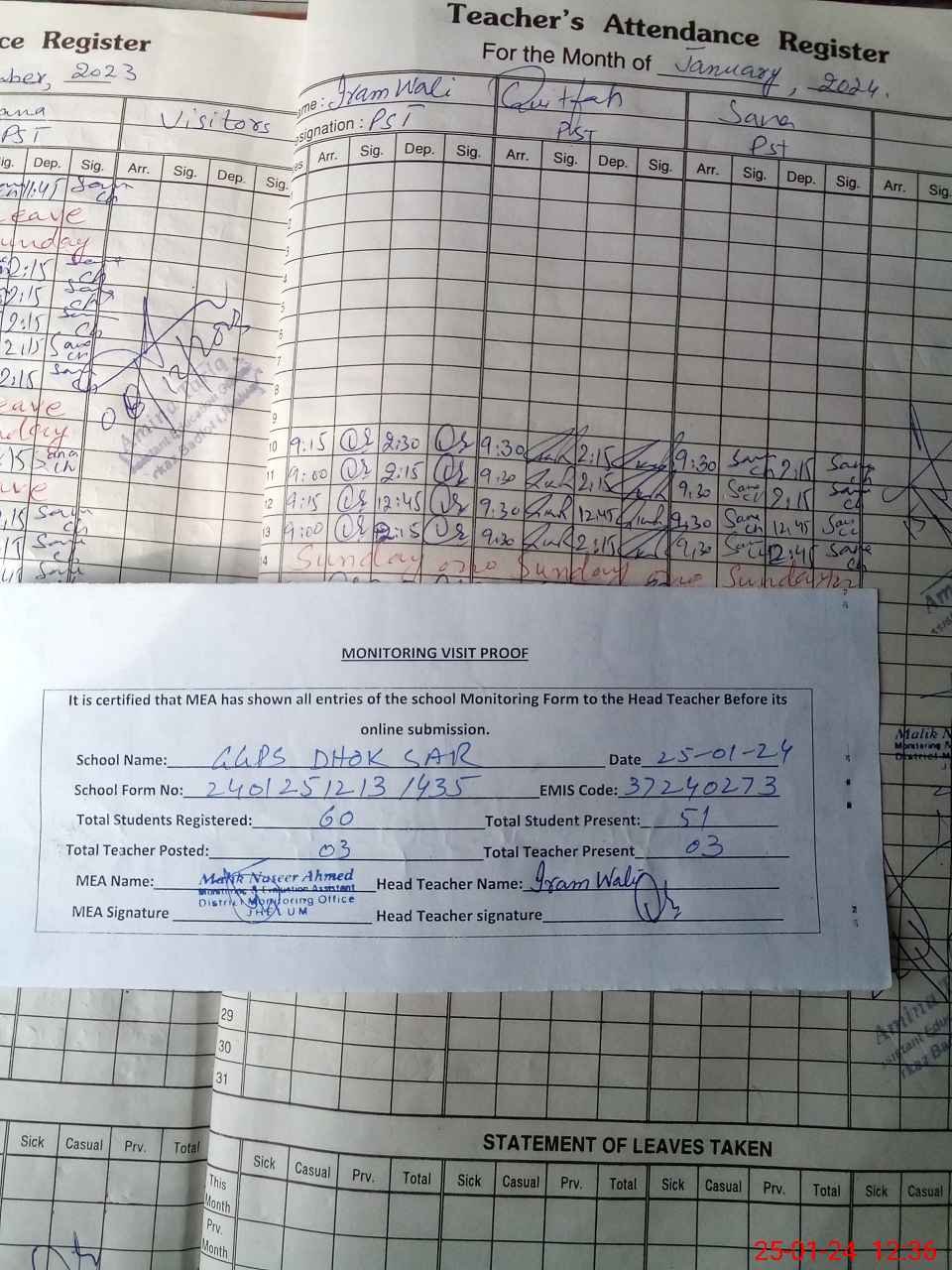 | Attendance Register | Head Teacher | MEA with School | Visit Proof |