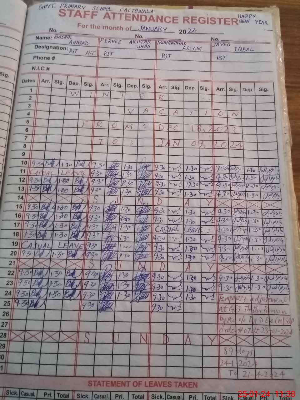 | CNIC | Full Name | Designation | R/C | Absence During Last Calender Month |