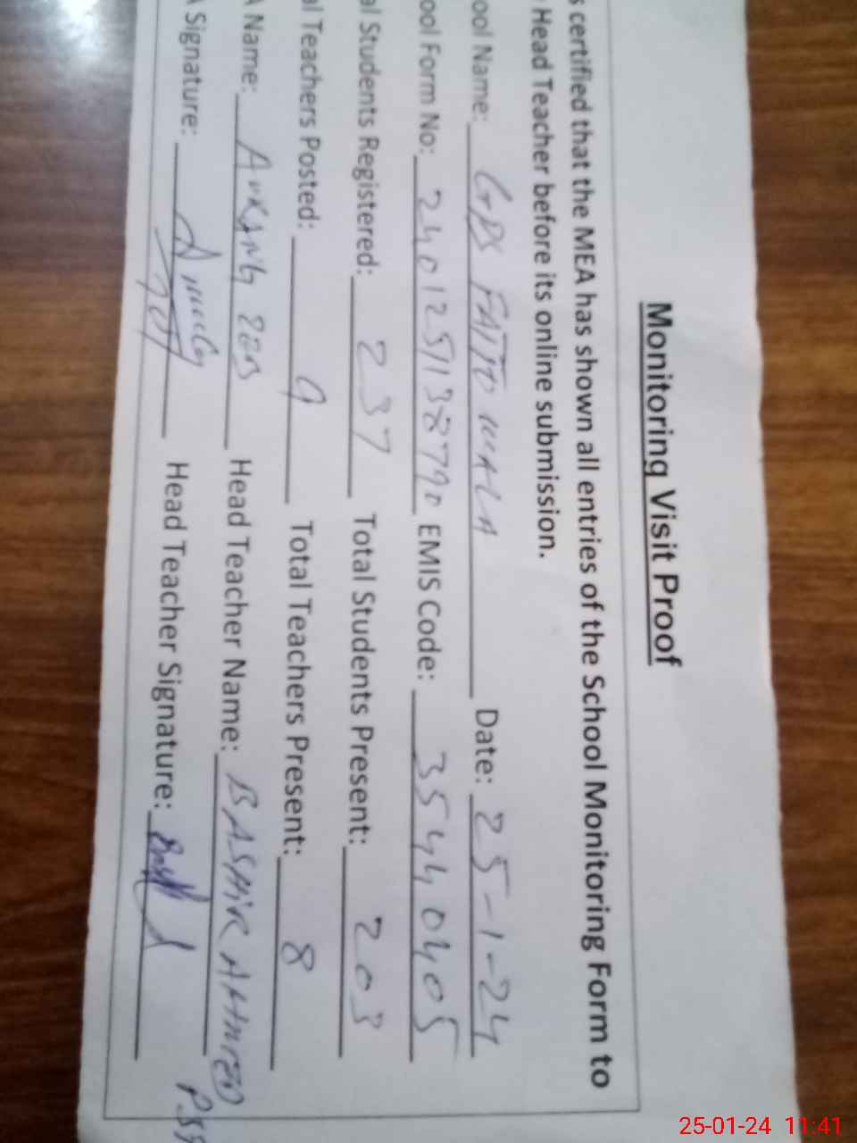 | Attendance Register | Head Teacher | MEA with School | Visit Proof |