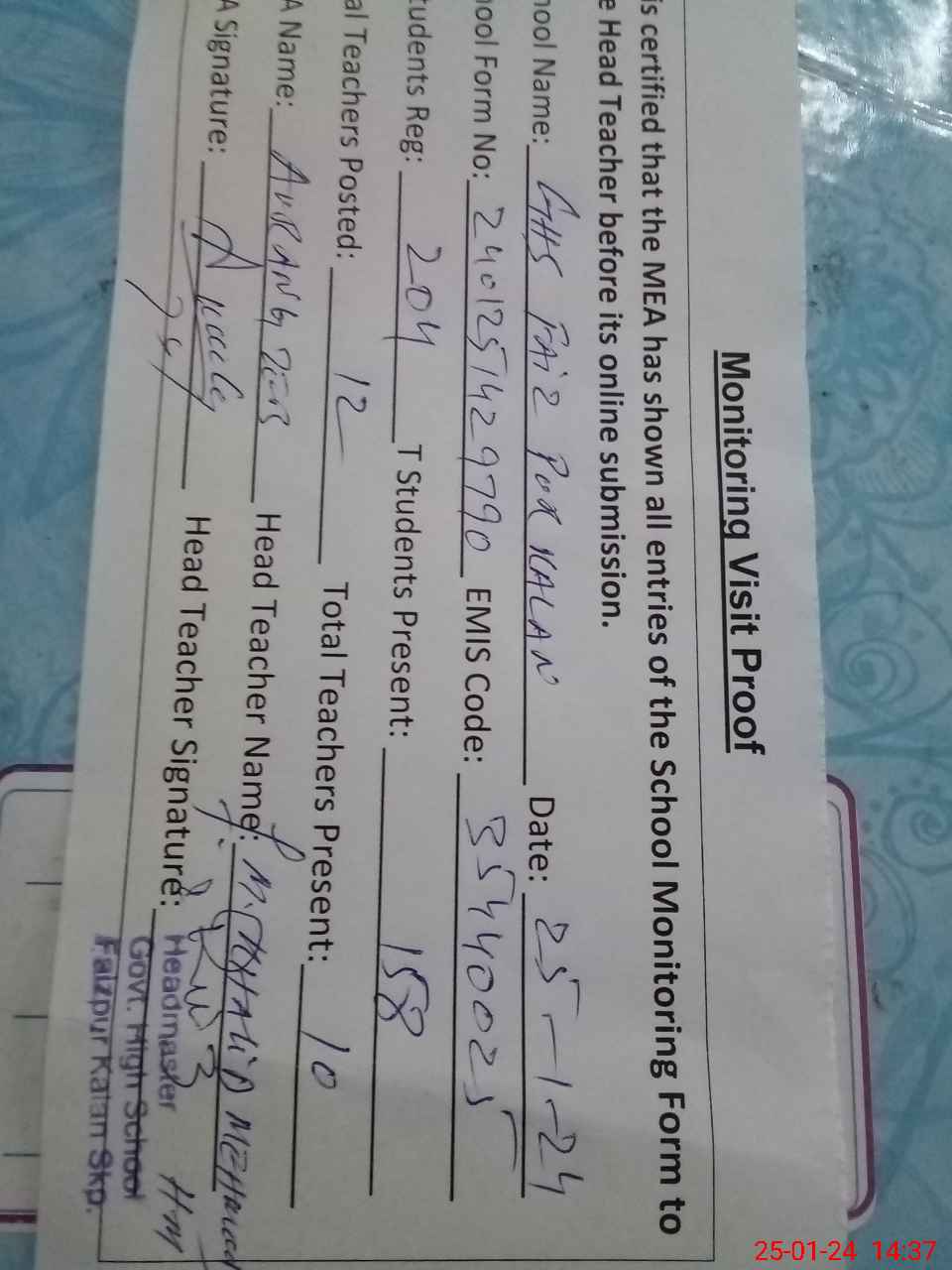 | Attendance Register | Head Teacher | MEA with School | Visit Proof |