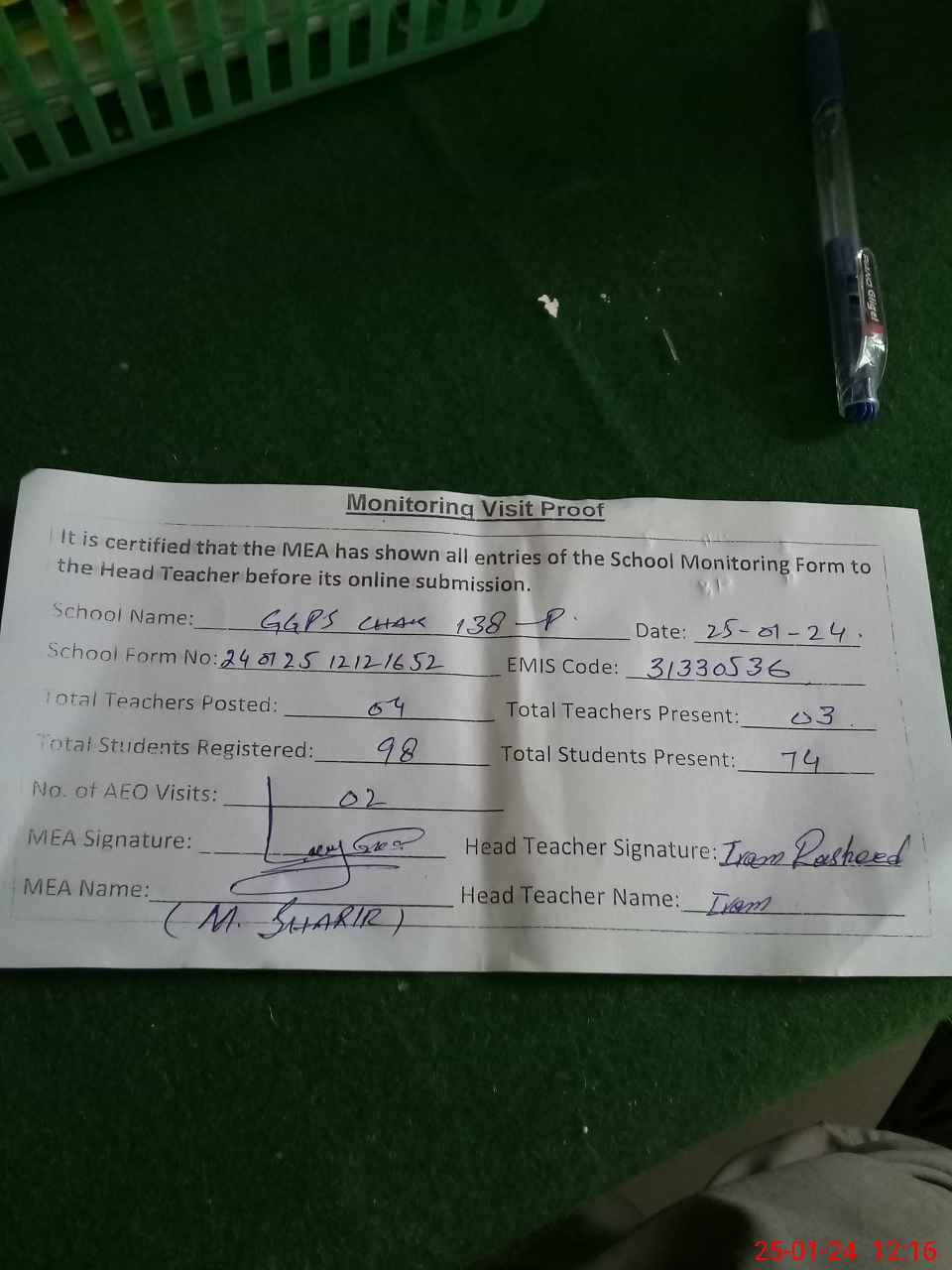 | Attendance Register | Head Teacher | MEA with School | Visit Proof |