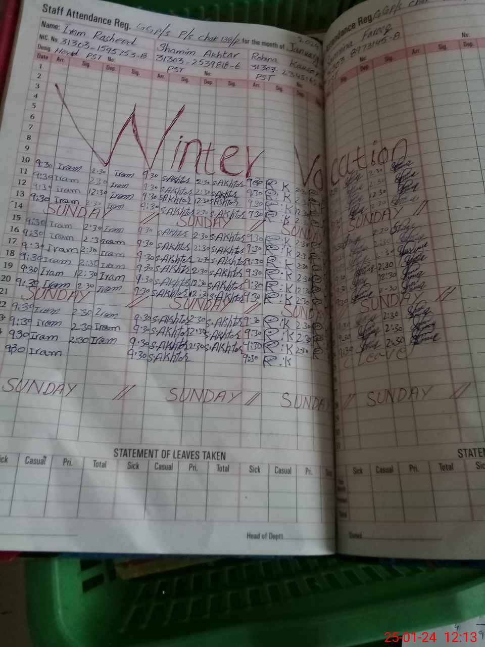 | CNIC | Full Name | Designation | R/C | Absence During Last Calender Month |
