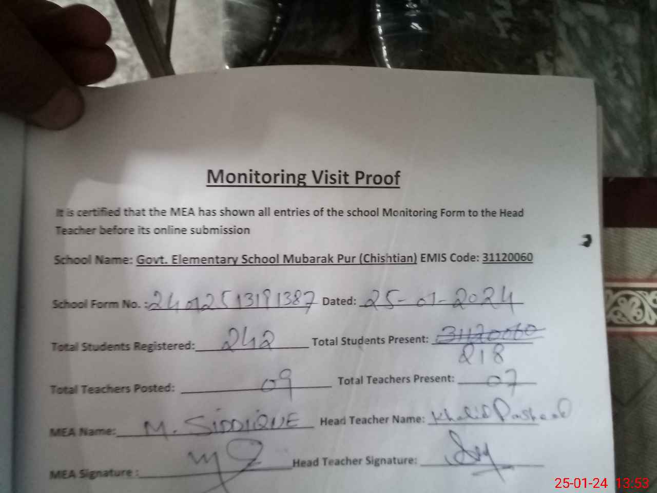 | Attendance Register | Head Teacher | MEA with School | Visit Proof |