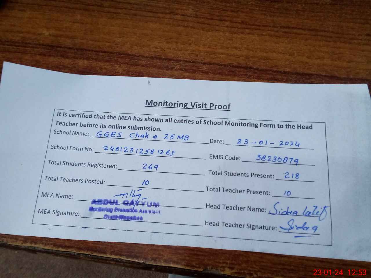 | Attendance Register | Head Teacher | MEA with School | Visit Proof |