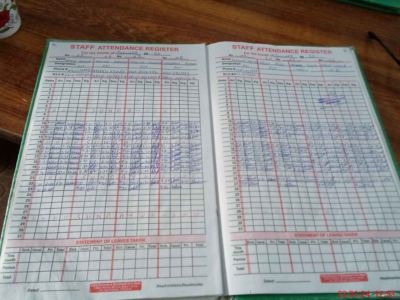 | CNIC | Full Name | Designation | R/C | Absence During Last Calender Month |