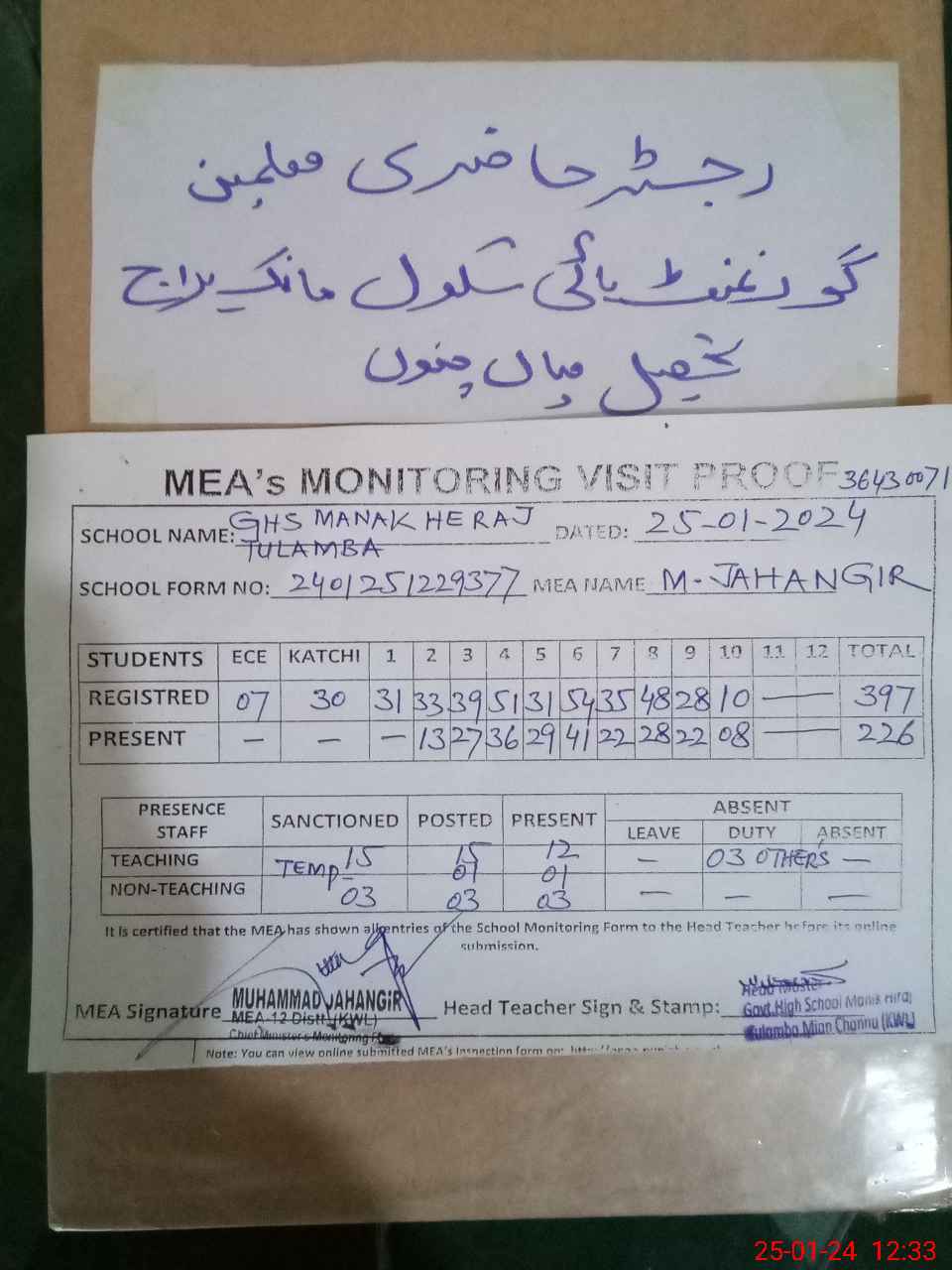 | EMIS Code: 36430071 | Name of School: GHS MANAK HERAJ, TULAMBA | |||