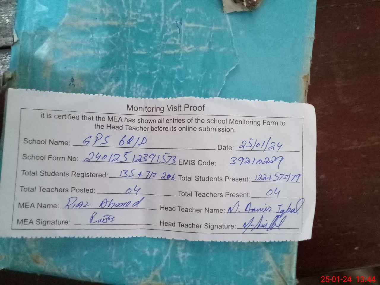 | Attendance Register | Head Teacher | MEA with School | Visit Proof |