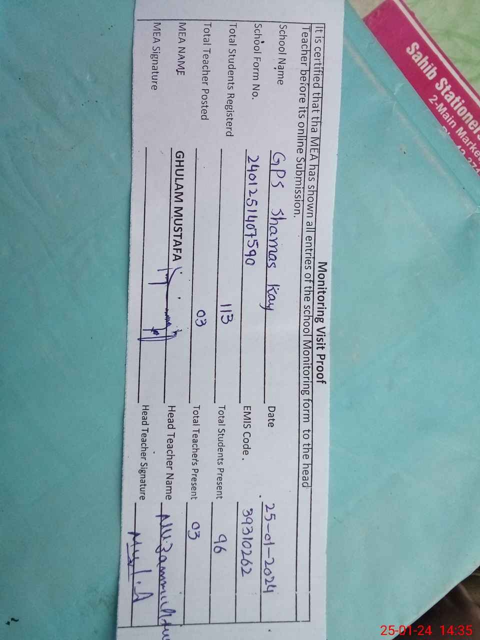 | Attendance Register | Head Teacher | MEA with School | Visit Proof |