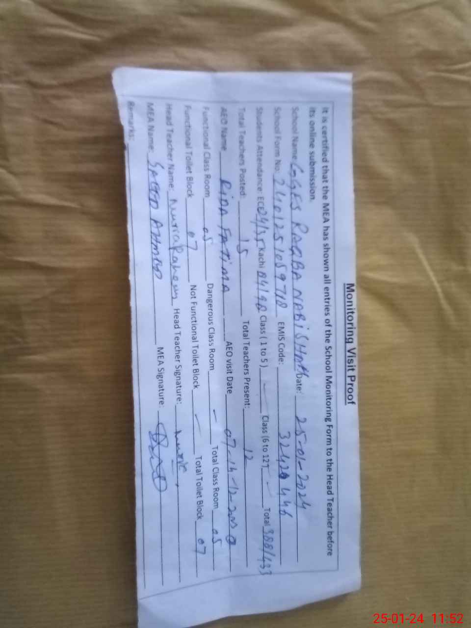 | Attendance Register | Head Teacher | MEA with School | Visit Proof |