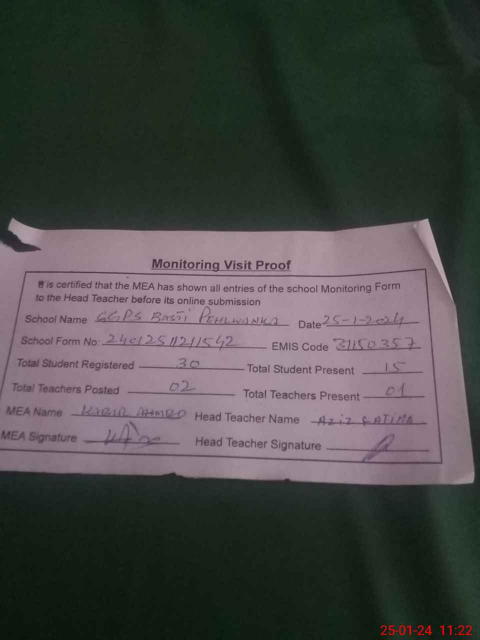 | Attendance Register | Head Teacher | MEA with School | Visit Proof |