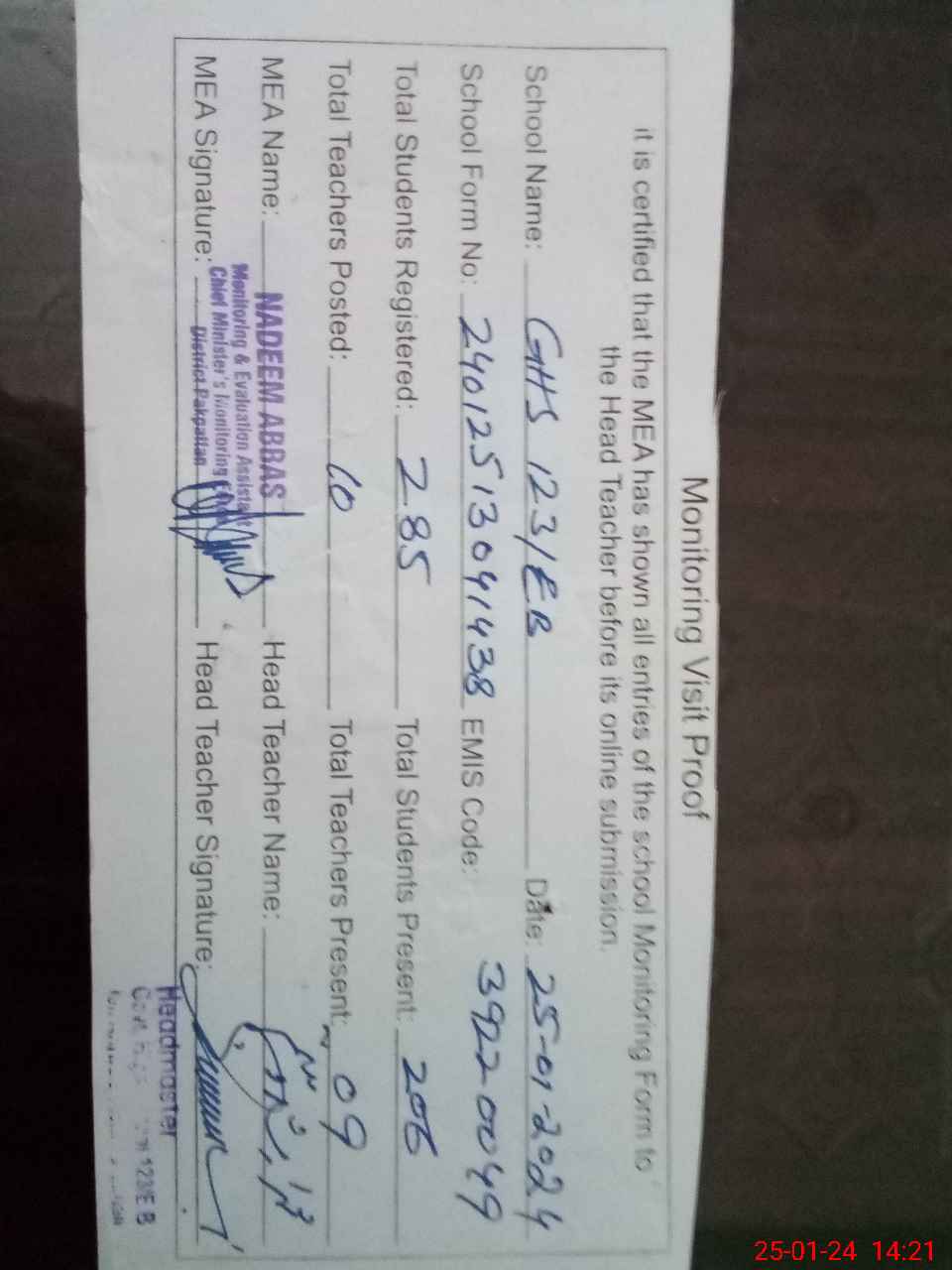 | EMIS Code: 39220049 | Name of School: GHS 123/EB P/O 121/EB ARIF WALA | |||