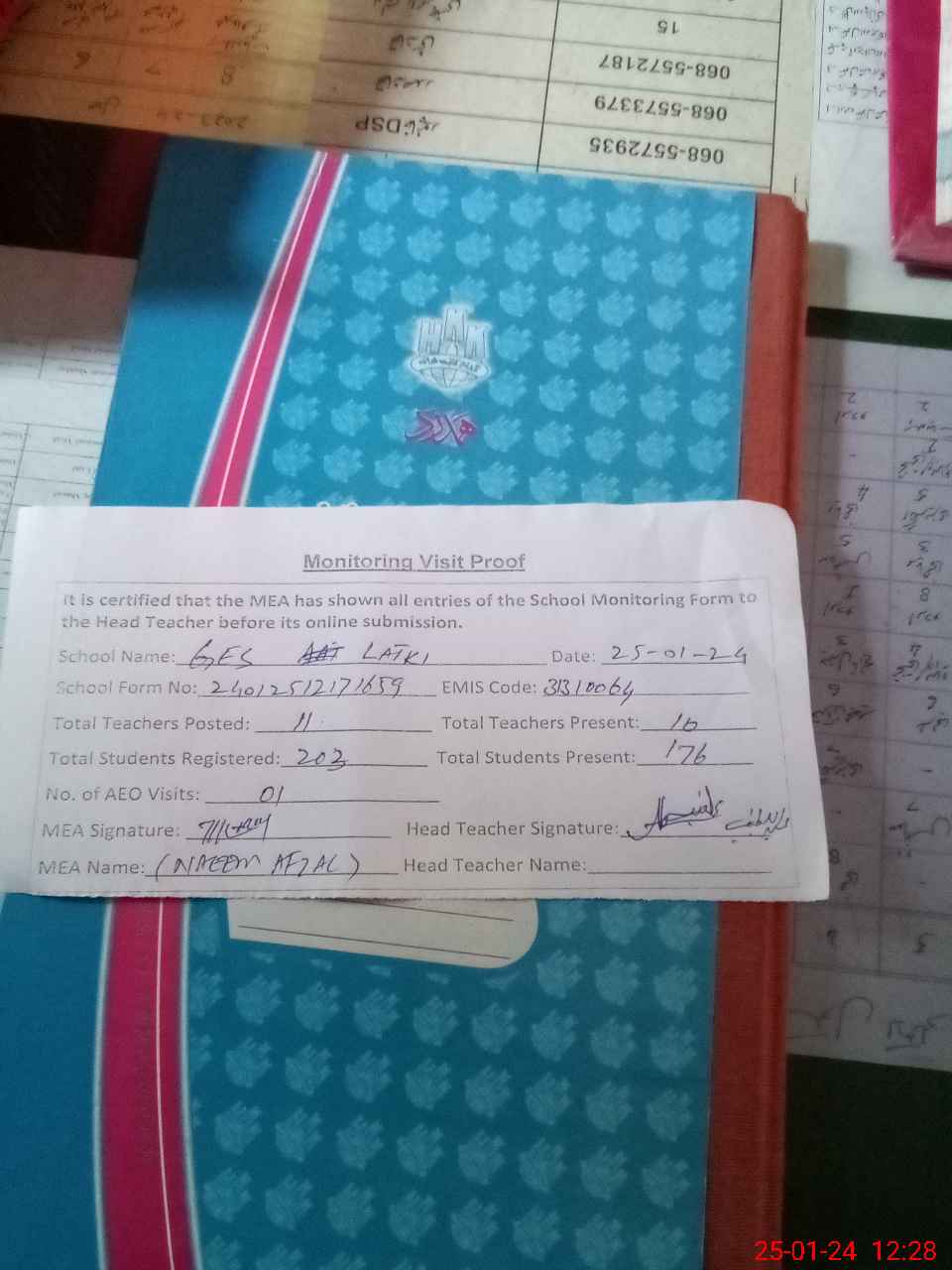 | Attendance Register | Head Teacher | MEA with School | Visit Proof |