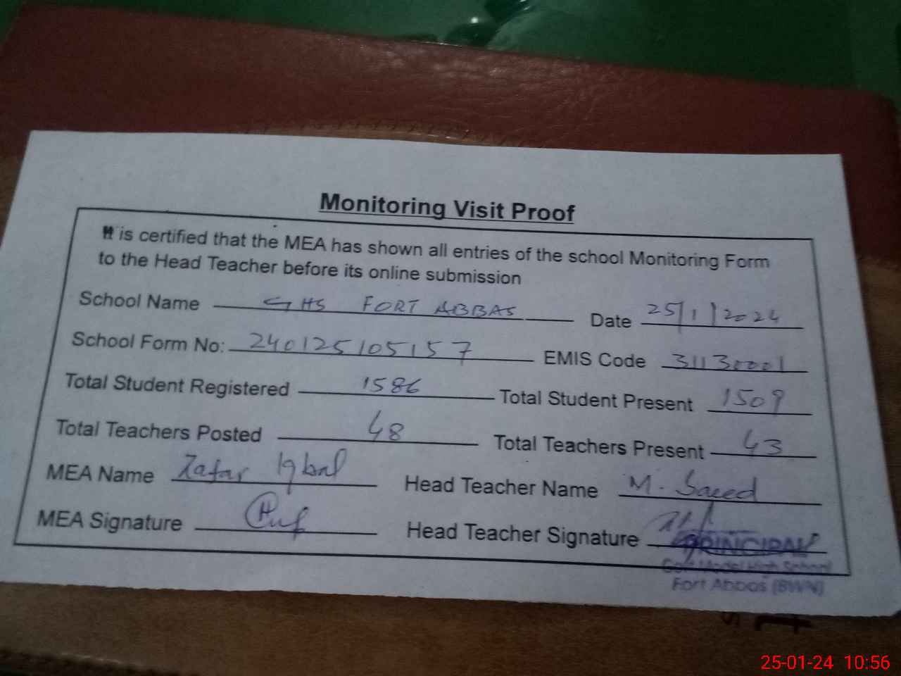 | Attendance Register | Head Teacher | MEA with School | Visit Proof |