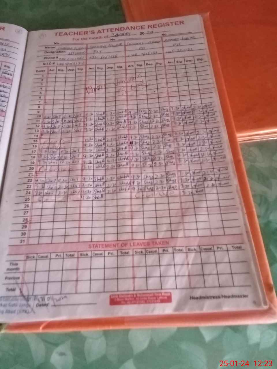 | Remarks (Use Separate Page if Required): Attendance coulmns of ECE and kachi are found blank therefore their attendance was filled zero No sanctioned leave is available against the absent teacher Shahida Tufail therefore she marked absent | |||||