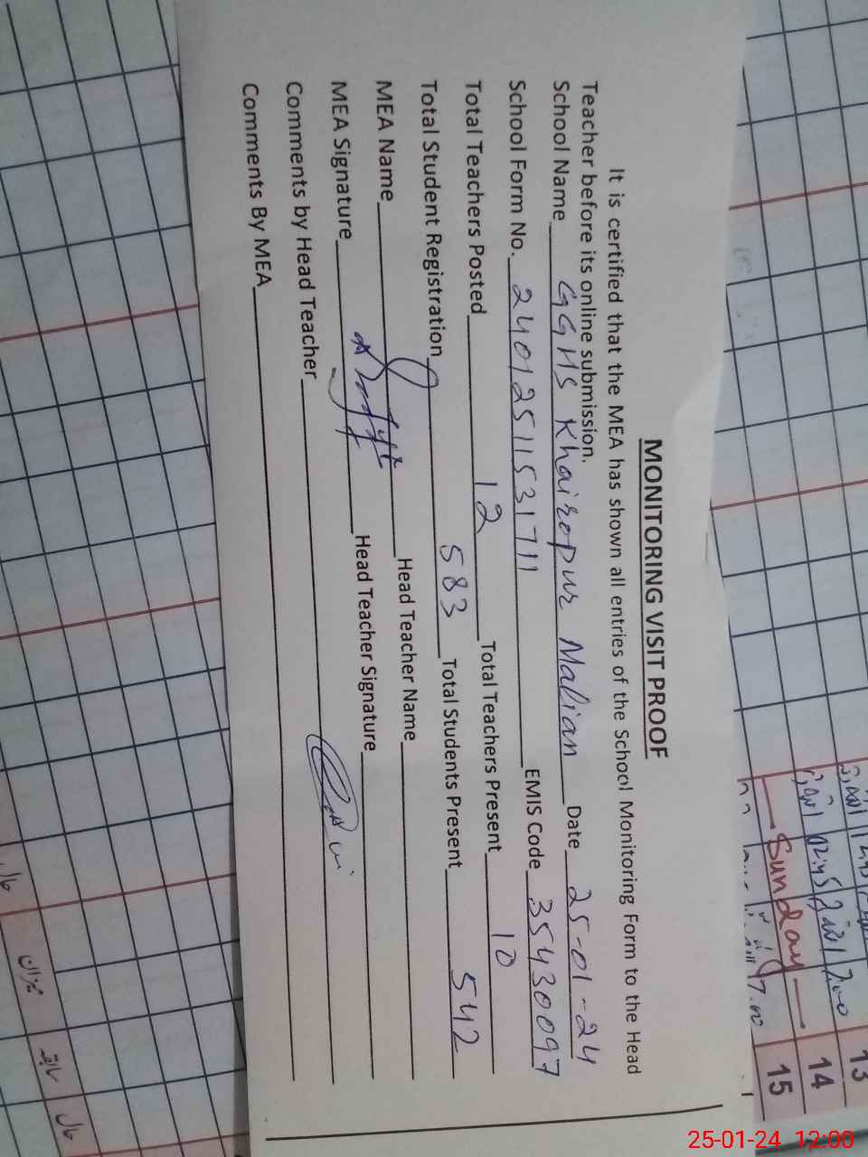 | Attendance Register | Head Teacher | MEA with School | Visit Proof |