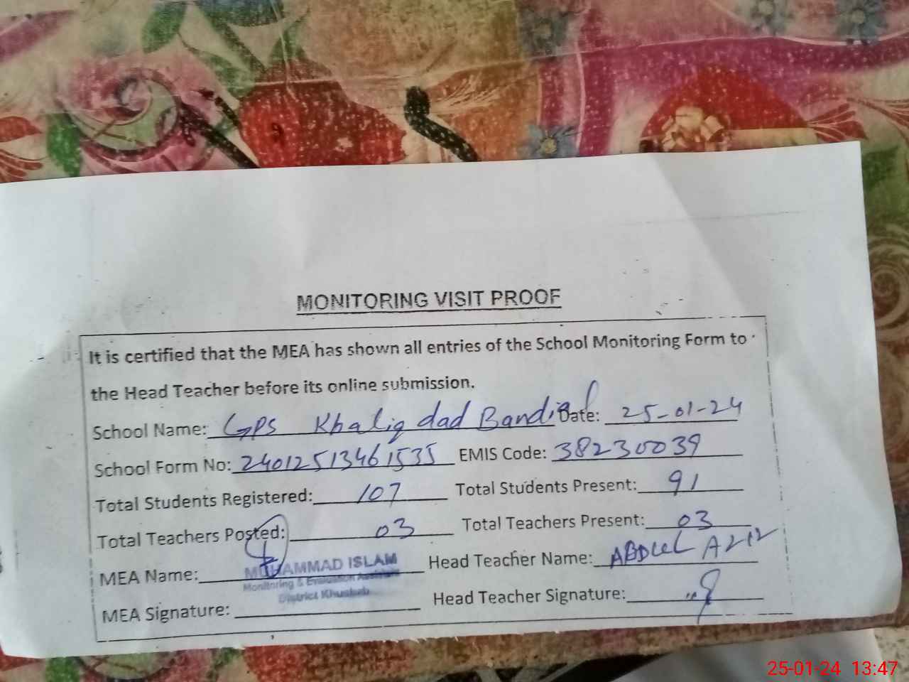 | EMIS Code: 38230039 | Name of School: GPS KHALIQ DAD BANDIAL | |||