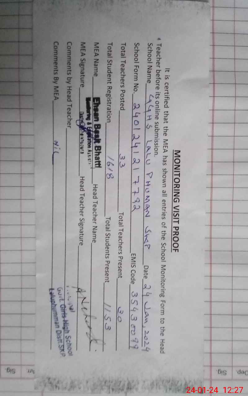 | EMIS Code: 35430099 | Name of School: GGHS LALU PHUMAN SHEIKHUPURA | |||