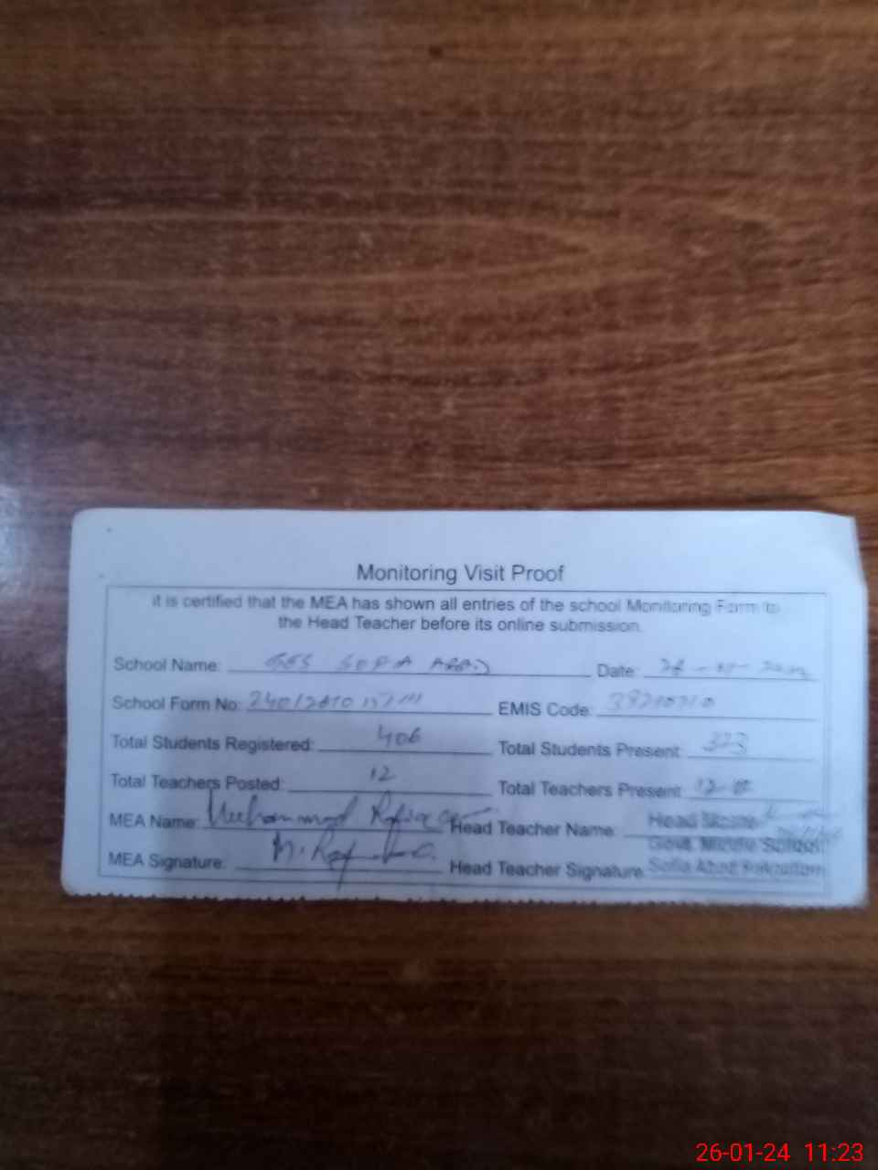 | Attendance Register | Head Teacher | MEA with School | Visit Proof |