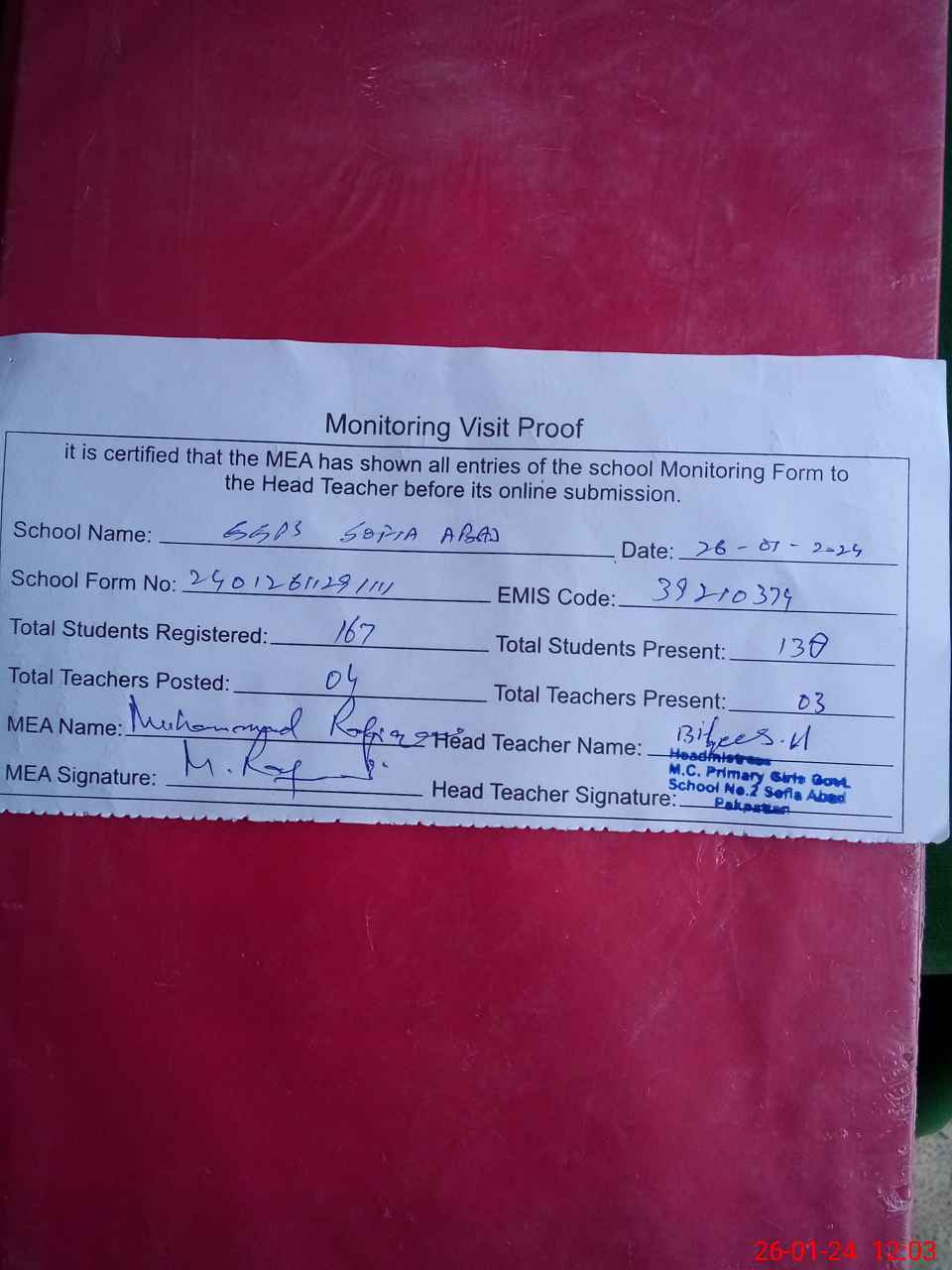 | Attendance Register | Head Teacher | MEA with School | Visit Proof |