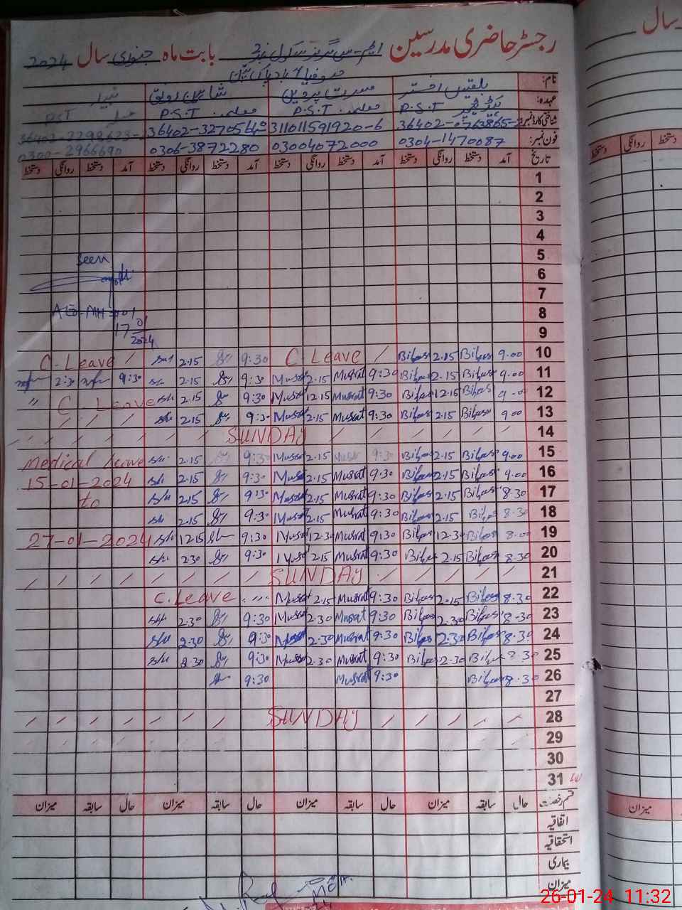 | CNIC | Full Name | Designation | R/C | Absence During Last Calender Month |