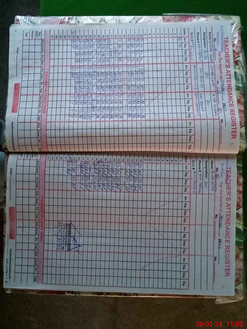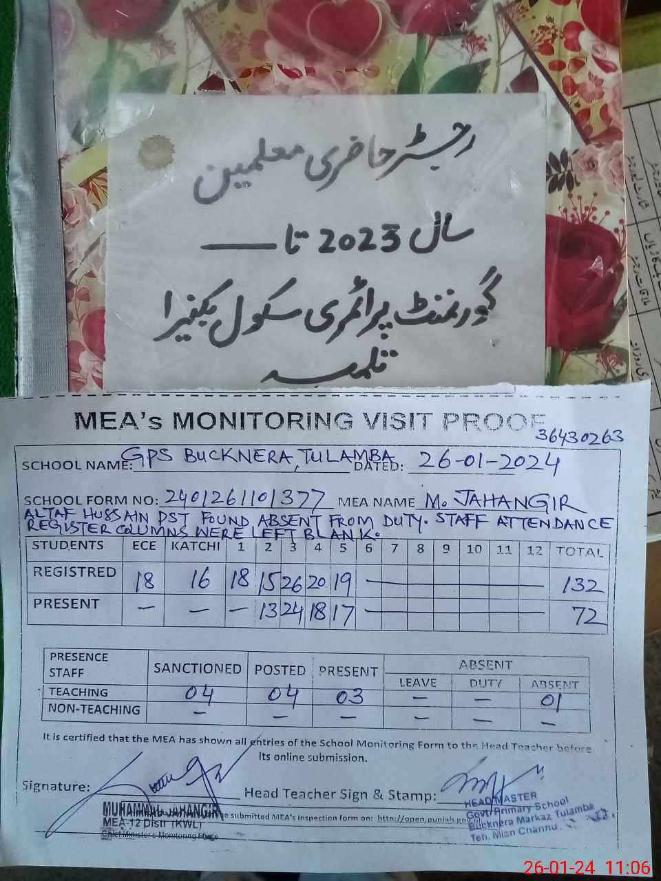 | Remarks (Use Separate Page if Required): THIS SCHOOL IS INSAF AFTERNOON SCHOOL ALTAF HUSSAIN PST FOUND ABSENT FROM DUTY STAFF ATTENDANCE REGISTER COLUMNS WERE LEFT BLANK NSB GRANTS AND FTF RECORDS ARE NOT MAINTAINED BANK STATEMENTS ARE NOT AVAILABLE LESSON PLANS ARE NOT AVAILABLE AFTERNOON CLASSES STUDENTS NO ATTENDANCE ON 25 JANUARY 2024 ECE KIT IS LYING IN HEAD TEACHER OFFICE RANDOM CLASS KATCHI IS NOW IN CLASS TWO | |||||