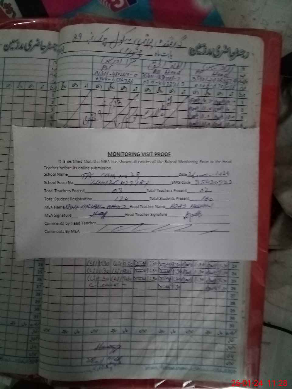 | Attendance Register | Head Teacher | MEA with School | Visit Proof |